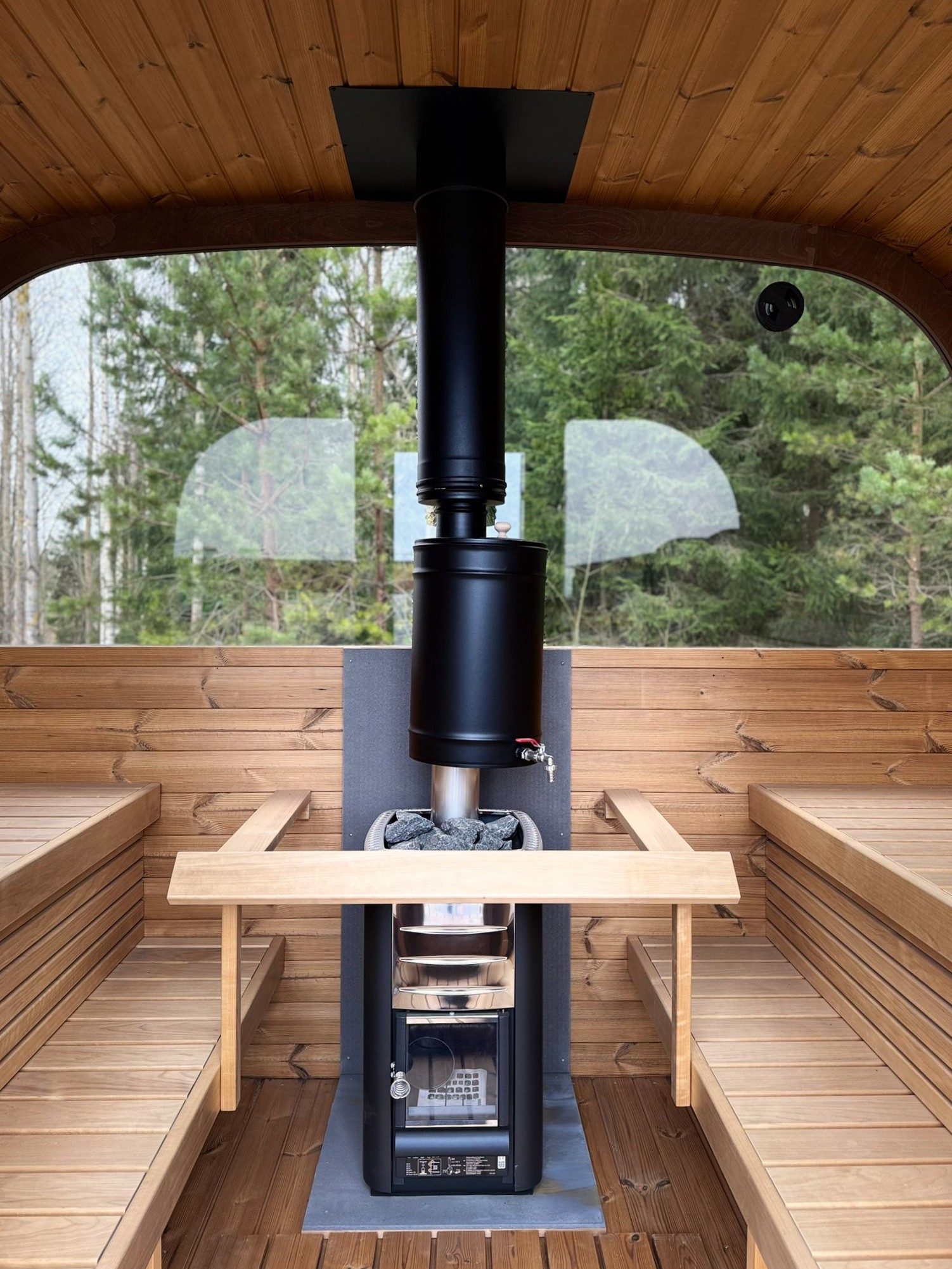 Cubus saunal on täisklaasist esisein. Tagaseinaks on poolkuuklaasiga sein.