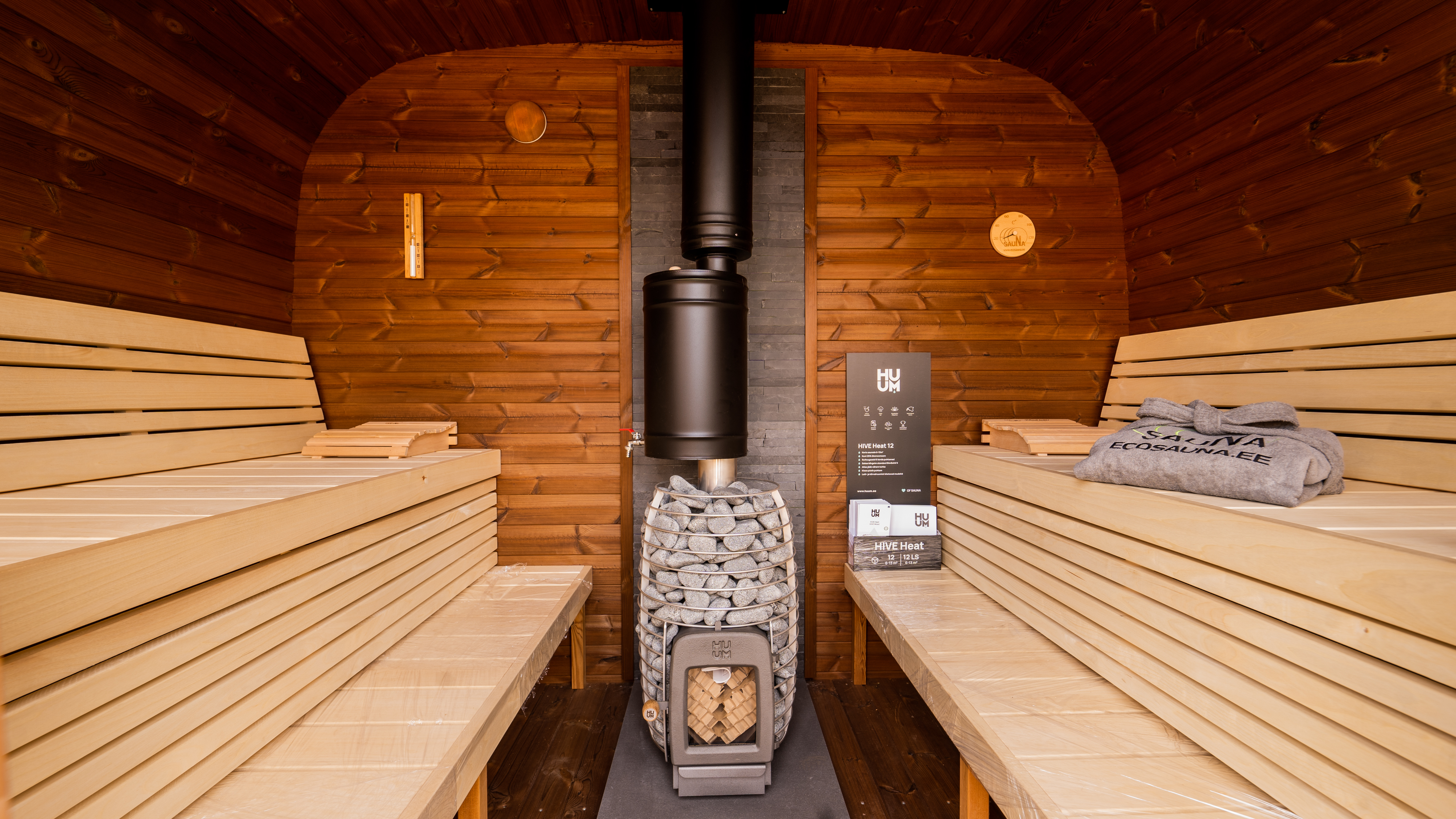 CUBUS sauna sobivad nii elektri- kui ka puuküttega kerised. Tuleohutuseks on põrandal ja tagaseinas tule- ja kuumakindel mineriitplaat.