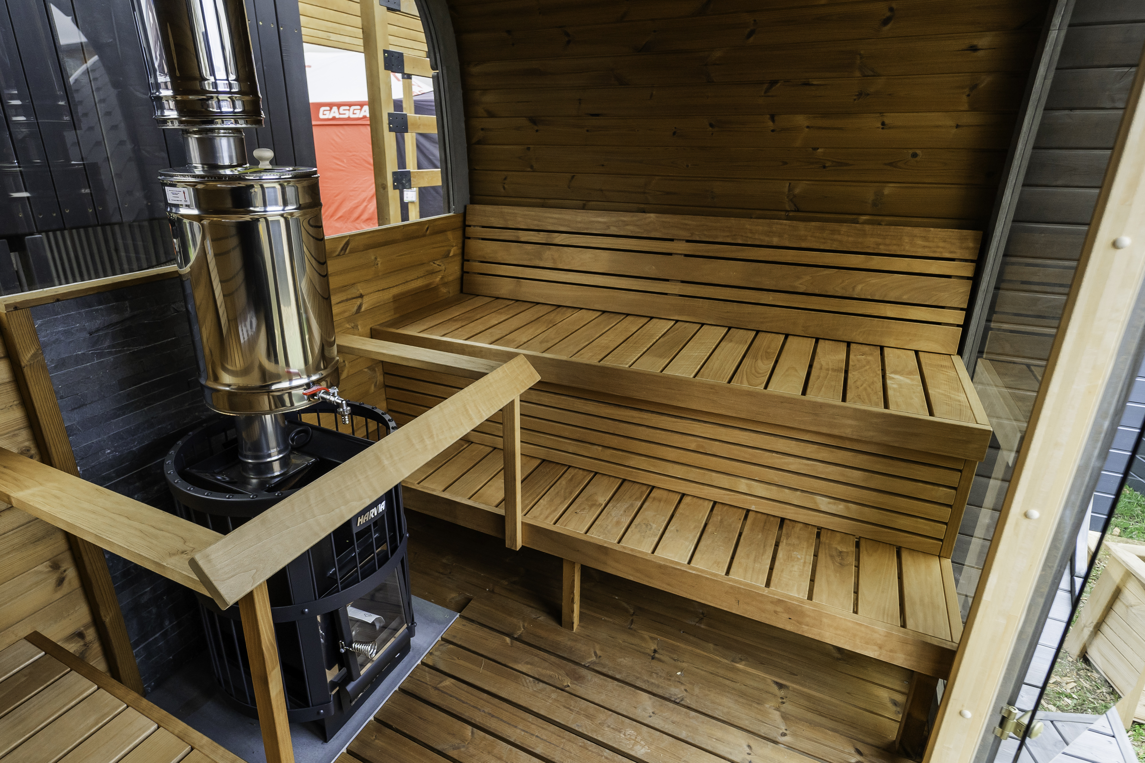 Sisustus koosneb paremale ja vasakule paigutatud sirgetest kahetasandilistest lavadest, mis on valmistatud lepast või termohaavast. Lisaks kuuluvad komplekti seljatoed, kerisepiire ja põrandarest, mis tõstavad nii mugavust kui ka ohutust. Kõrgem lagi ja kahetasandiline lava tagavad meeldivama leiliruumi kogemuse.