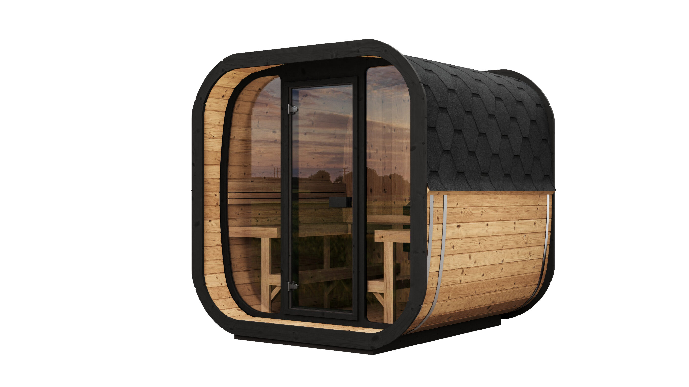Esisein on saadaval kahes variandis: täisklaas (valikus pronks või peegelklaas) või klassikaline puidust sein. Tagaseinaks saab valida täispuidust lahenduse või poolkuu-kujulise klaasiga variandi (pronks või peegel). Suurem, 70×192 cm karastatud klaasuks (pronks või peegel) loob avara ja avatud tunde ning laseb saunaruumi loomulikul valgusel voolata.